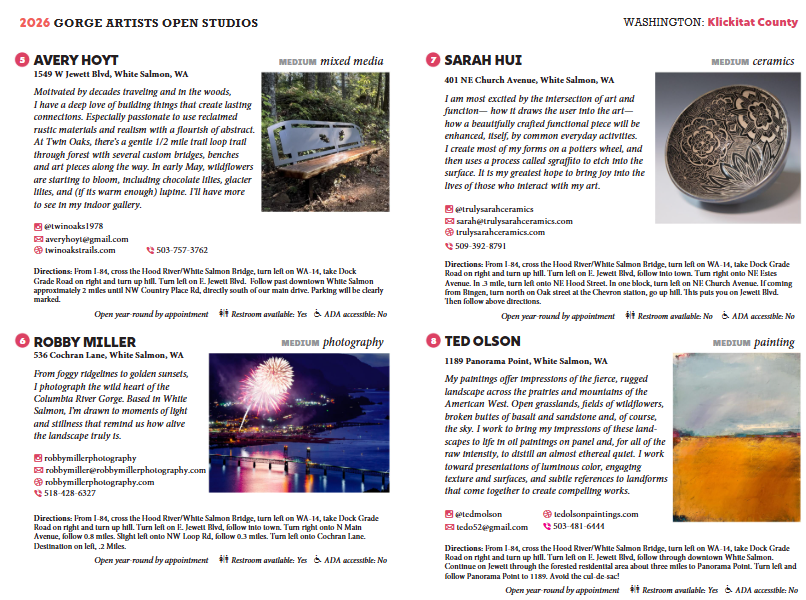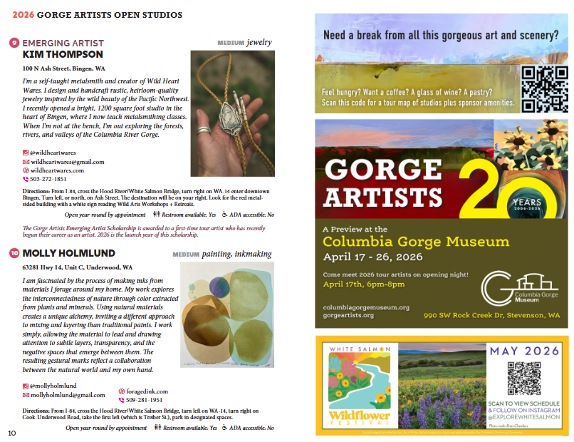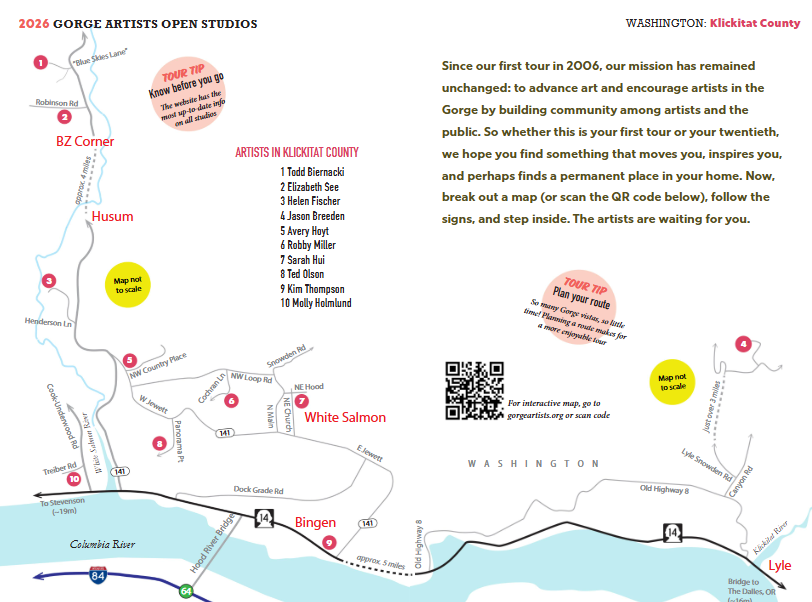 Gorge Artists Open Studios Tour is celebrating 20 Years in 2026! Join us the first weekend of May and the first weekend of the White Salmon Wildflower Festival! The White Salmon Valley has 9 participating artists between Bingen, White Salmon up to BZ Corner in the tour this year!