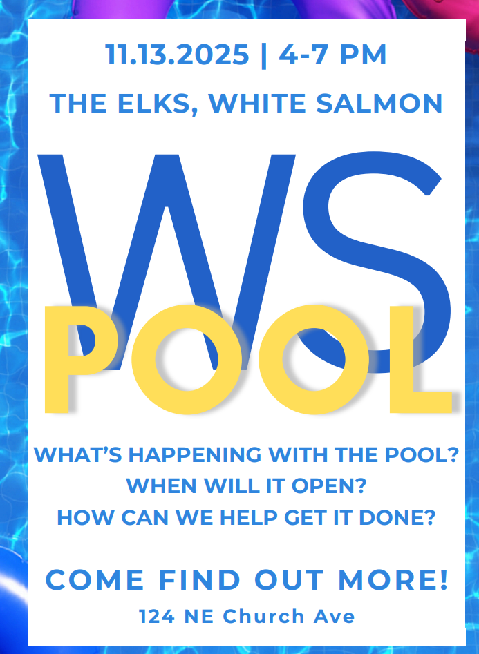 The White Salmon Valley Pool project has been years in the making—and now, our community is closer than ever to bringing a new community pool to life. On Thursday, November 13, from 4-7 pm join neighbors, volunteers, and the Park District board at the White Salmon Elks for a Pool Open House to learn where the project stands, what comes next, and how you can help make the new pool a reality.